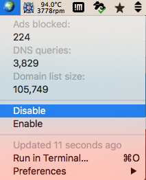 Here is the updated script (notice that I’ve changed, in line 20, the URL of the Pi-Hole to how it announces itself on the net independent of the IP address you gave to it; lines 35-37 are those that I have added to provide for enabling and disabling of the service):