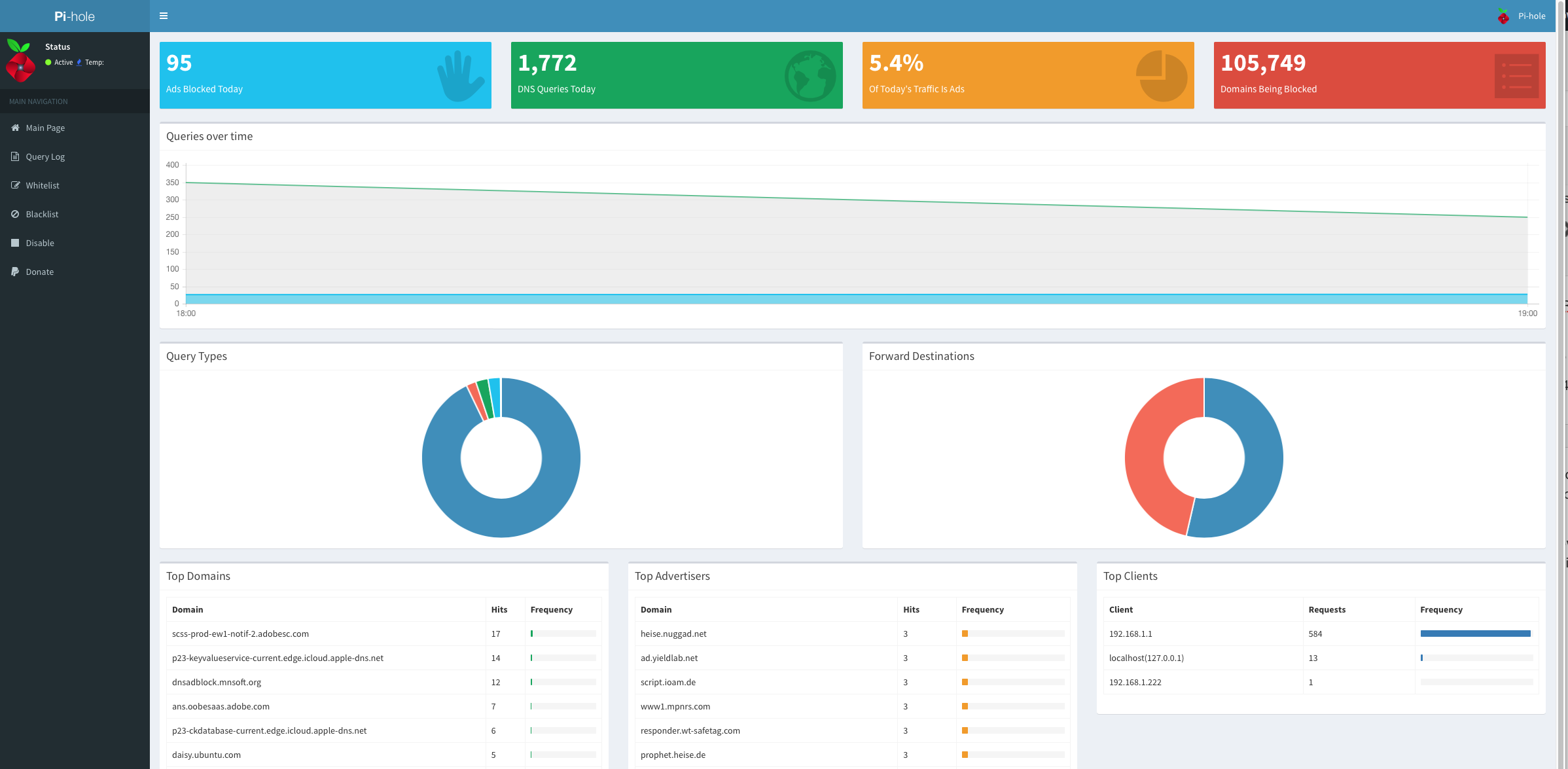 As you can see, the vast majority of my requests come from 192.168.1.1, which is my OpenWRT router that is now redirecting the DNS requests it gets – which means mostly all – through the Pi-Hole box.