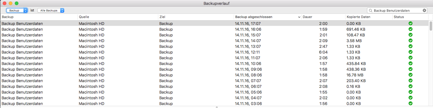 Turns out, the hourly backups there take an average of less than 2 minutes. Which actually is quite awesome – and much much faster than TimeMachine itself: