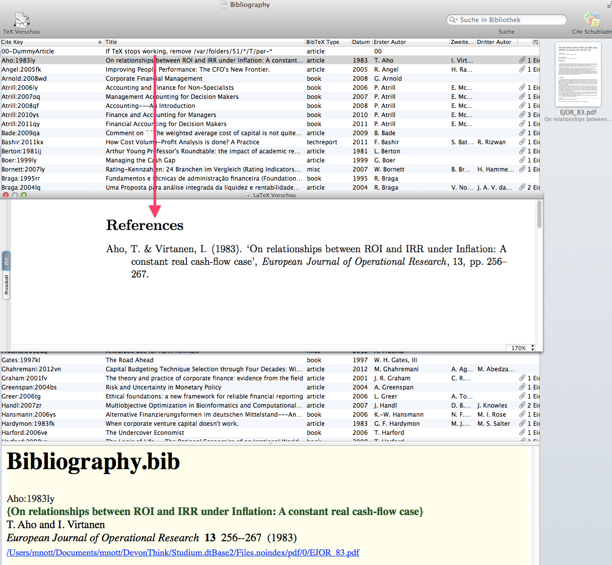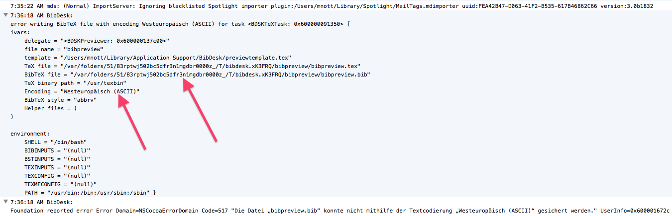 As you can see in the image above, the encoding is somehow broken. And yes, I got an error in BibDesk as I wanted to preview. I had the good idea to look into the system log and saw that actually there was an encoding error, and it even said in which directory it happened to be in – which was of course the directory that a long while ago I had already figured out by trial and error. Turns out, while the LaTeX log won’t tell you anything in this case, BibDesk actually captures the error – so it makes sense to check out the system log, as well: