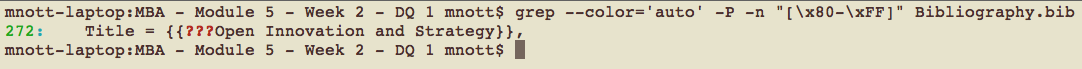 So obviously when copy-pasting the metadata from the article that I had downloaded somewhere, OSX was overly intelligent and copied over some special characters that I really don’t want in that ASCII file. Here’s a way how to locate those: