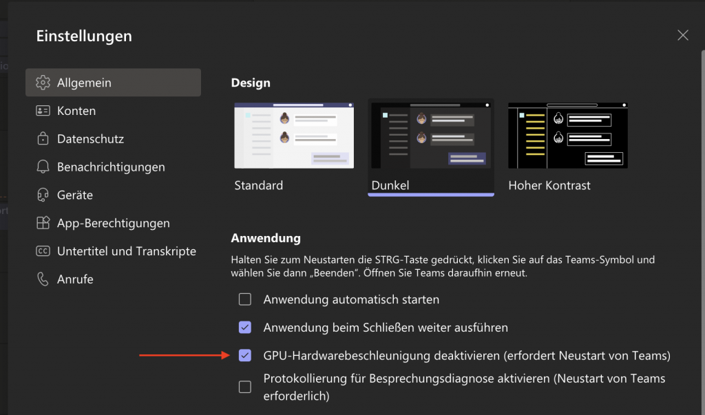 First, disable GPU acceleration within teams. To do so, go to the Settings of Teams, and check this box: