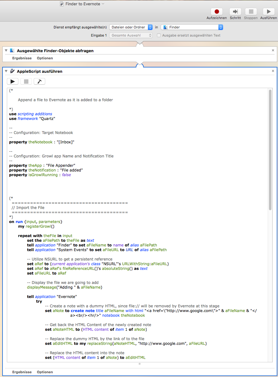 As a follow-up to my post on how to automatically add files to Evernote, keeping persistent links, here is a slightly reworded automator workflow that I use to do the same thing: Mark one or multiple files in Finder and then Hit Cmd-E to have them added to Evernote’s Inbox, while at the same time having those notes in Evernote contain hyperlinks to the original file which are persistent even if the original file is moved around.