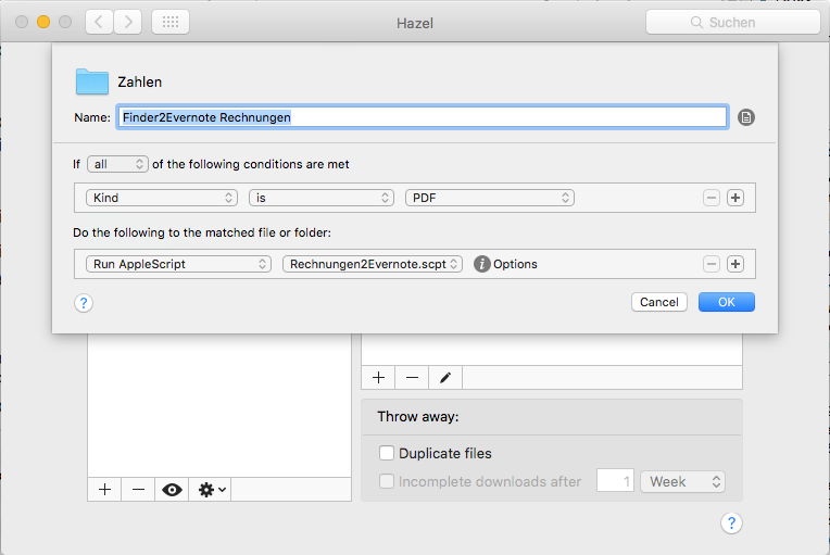 In the above I reference the script and also have a condition that I only want to use it for PDFs – that’s of course something that you may want to change. Similarly, what you see at the top of the script itself is that I set the name of the target notebook to “Rechnungen” (German for: “invoices”). That equally is something you may want to adapt.
