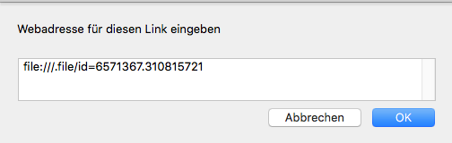 As you can see, there’s only a numeric ID in the link, which works on the local file system without revealing further information; the file system in turn will keep track of where that file actually is, so that if I move it around, the hyperlink still works.