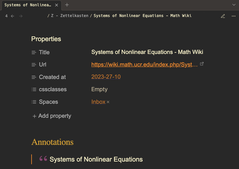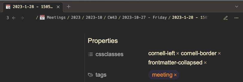 So the solution to that is of course to not do this all of the time, but to have the frontmatter-collapsed there optionally, and use it where needed, typically via a Templater plugin. For the rare cases where I don’t want to see any frontmatter (Dashboards), I use the frontmatter-hidden class, and particularly for Memex, where I have no control over the yaml that Memex writes, I will go with the default Obsidian behavior: