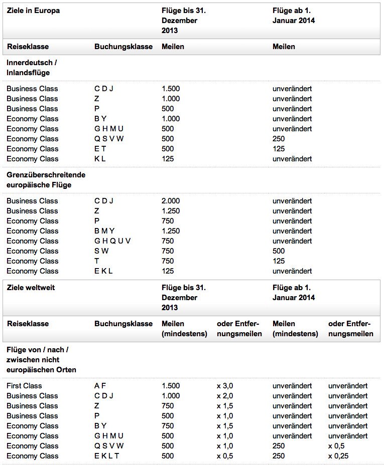 Worse, if you’re counting on accumulating miles on your transatlantic flights, before you may have collected the round about 7500 miles one-way from Europe to the West Coast (miles times 1.0). Now, in those el-cheapo classes (ears between your knees), you’re earning half the amount of miles. And in those classes E, K, L, T – where you’d rather be doing a bus journey had not someone messed up tectonics and added a lot of water between the continents – you’re actually only earning 25 percent of the miles you were earning previously.